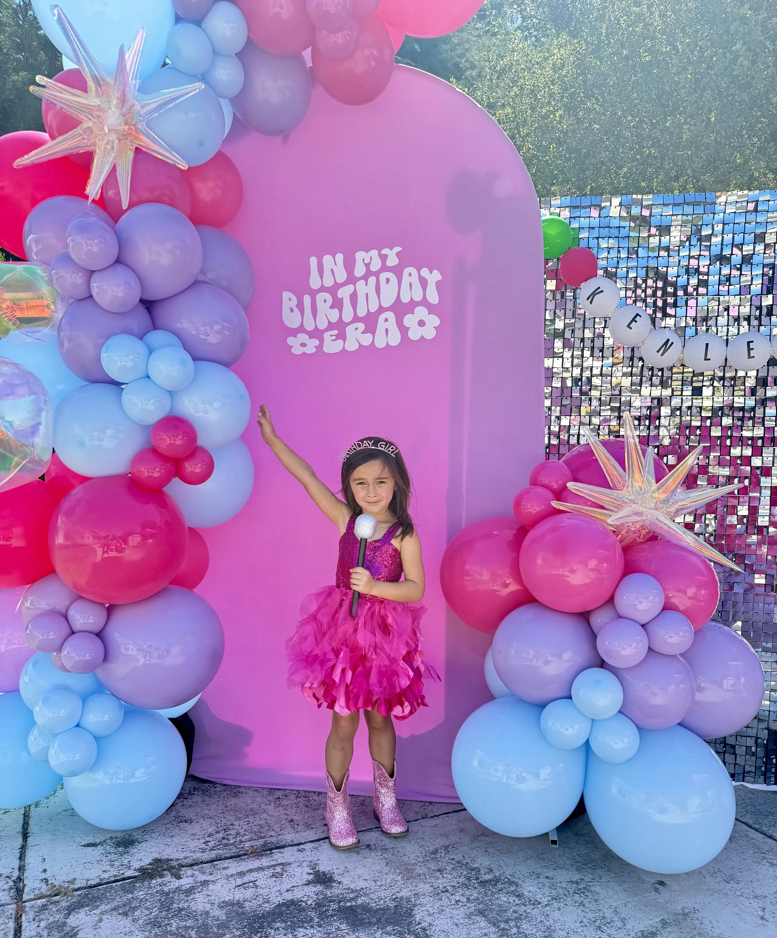 Backdrop + Balloon Garland : 7.2 ft X 4 ft custom fabric arch backdrop with personalized lettering with a 5X5 Shimmer Wall Backdrop